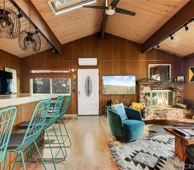 Welcome to this beautifully upgraded mountain retreat set on an expansive lot of two combined parcels, offering unmatched space, privacy, & flexibility. This versatile home features two separate units (which can easily be converted into one huge unit if you so prefer), making it ideal for multi-generational living, rental income, or guest accommodations—all while enjoying serene tree and lake views. Step into an inviting open-concept living area with vaulted ceilings, abundant natural light & a charming brick fireplace.